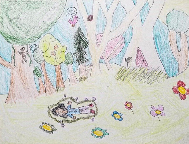 Child’s drawing of a forest with a child laying down beside flowers